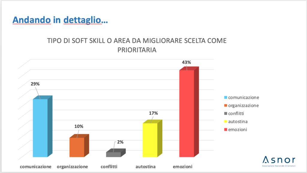 Andando nel dettaglio dei risultati emersi (si veda Figura), l’area delle competenze individuata dagli studenti come quella maggiormente da migliorare è stata quella delle emozioni, seguita dall’area della comunicazione e da quella dell’autostima.